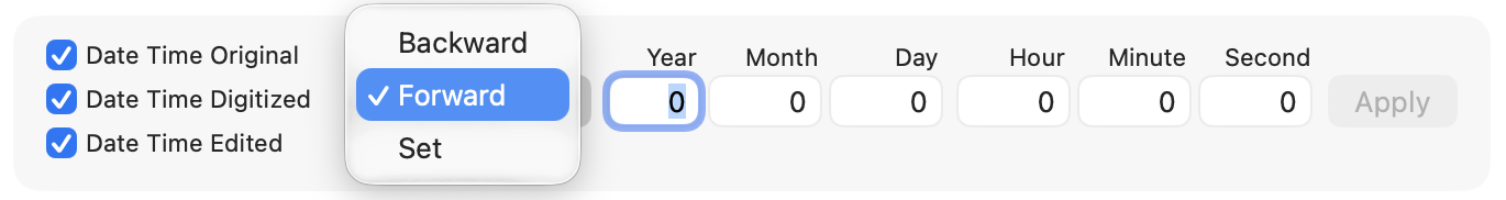 Enter values in the fields at the top of the window and click Apply to update all date and time fields that are checked for editing.