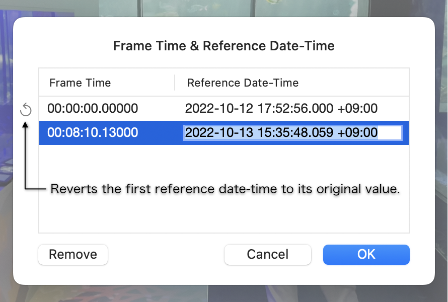 This date-time is treated as the reference point, and the app calculates the date-time of each frame by adding its frame time. The calculated values are then saved as Exif metadata.