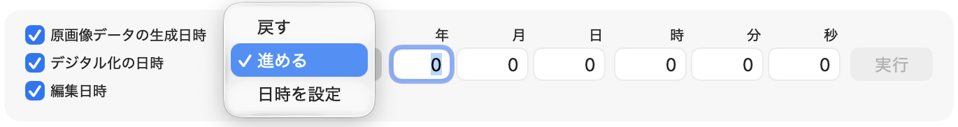 ウインドウ上部のフィールドに数値を入れ、「実行」すると、編集対象にチェックされてる日時すべてが変更されます。
